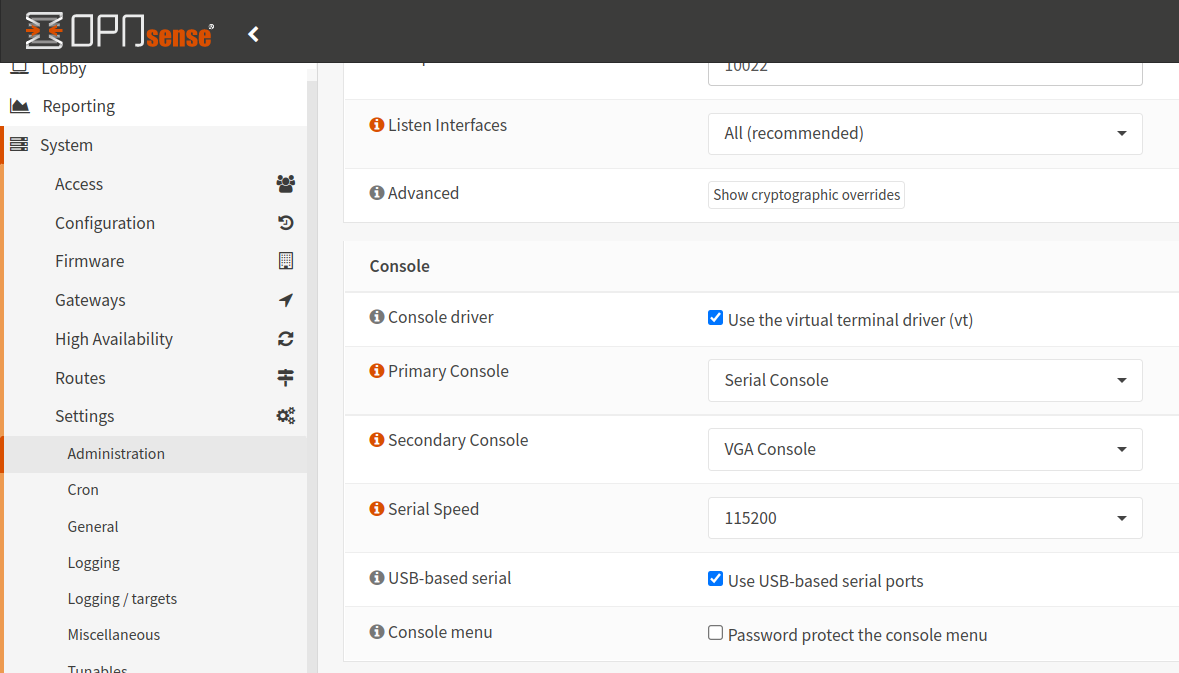 이와 관련하여 하나 알아낸 것은 이 포트를 통해 입력까지 가능 하려면 OPNsense 설치 시 image type을 VGA가 아닌 Serial로 다운로드 받고 설치해야 한다는 점입니다. 저는 첫 설치 시 데스크탑 PC의 부품들을 유용해서 설치했기에 VGA type을 선택해서 OPNsense에서 아래와 같이 primary console을 Serial로 설정해도 출력 밖에 되지 않았습니다.