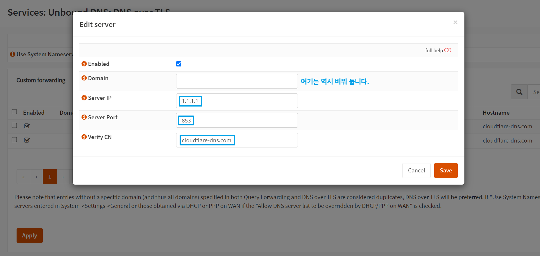 그 뒤 + 버튼을 눌러 1.1.1.1과 1.0.0.1 두 개 서버를 등록해야 합니다. 두 서버 모두 포트는 853으로, CN 정보는 cloudflare-dns.com을 입력 합니다.