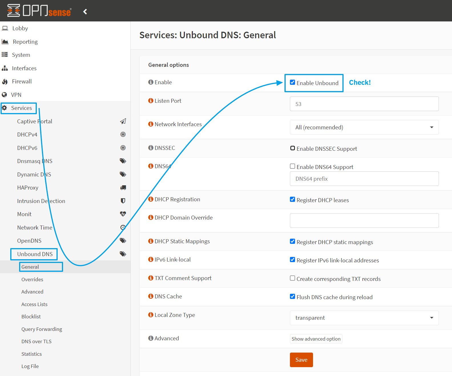 Services > Unbound DNS > General을 선택한 후 Enable 항목을 체크해 주면 바로 실행이 됩니다.