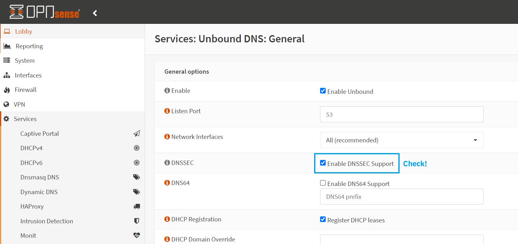 우선 Services > Unbound DNS > General 메뉴에서 DNSSEC 설정을 활성화 합니다.