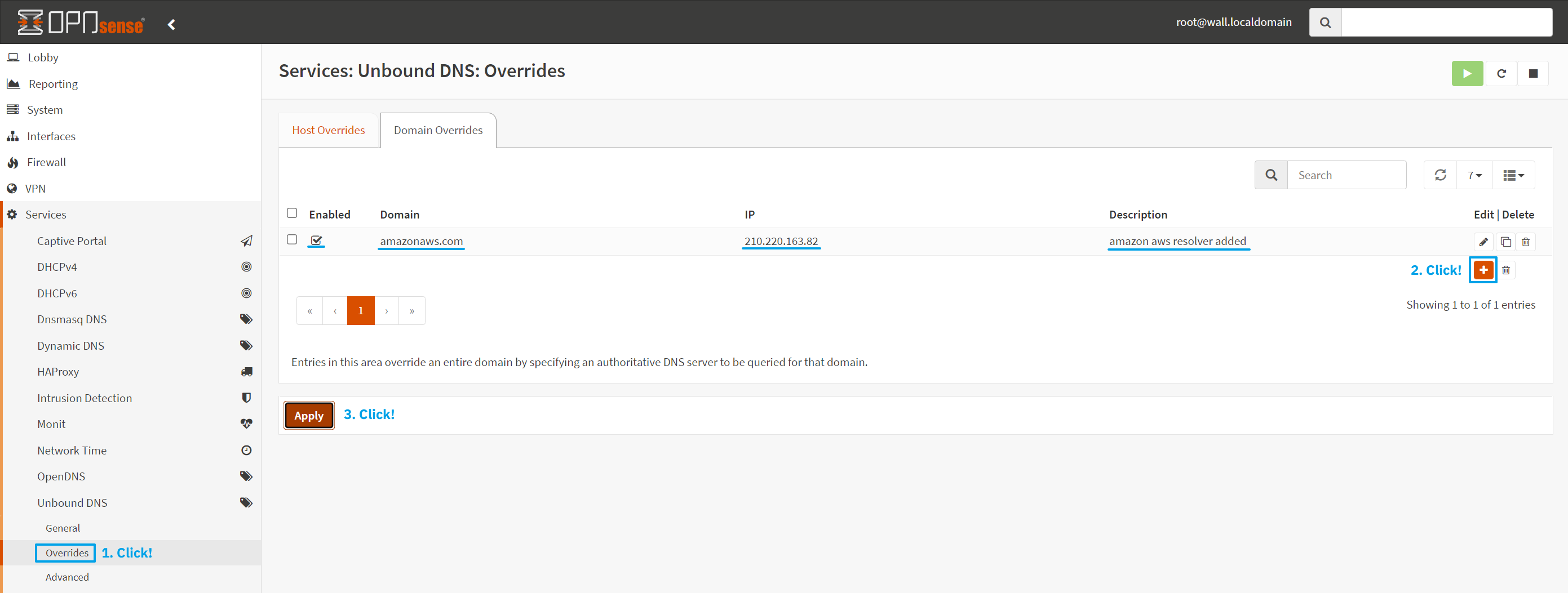 Services > Unbound DNS > Override 라는 메뉴에서 아래와 같이 등록하면 끝입니다.