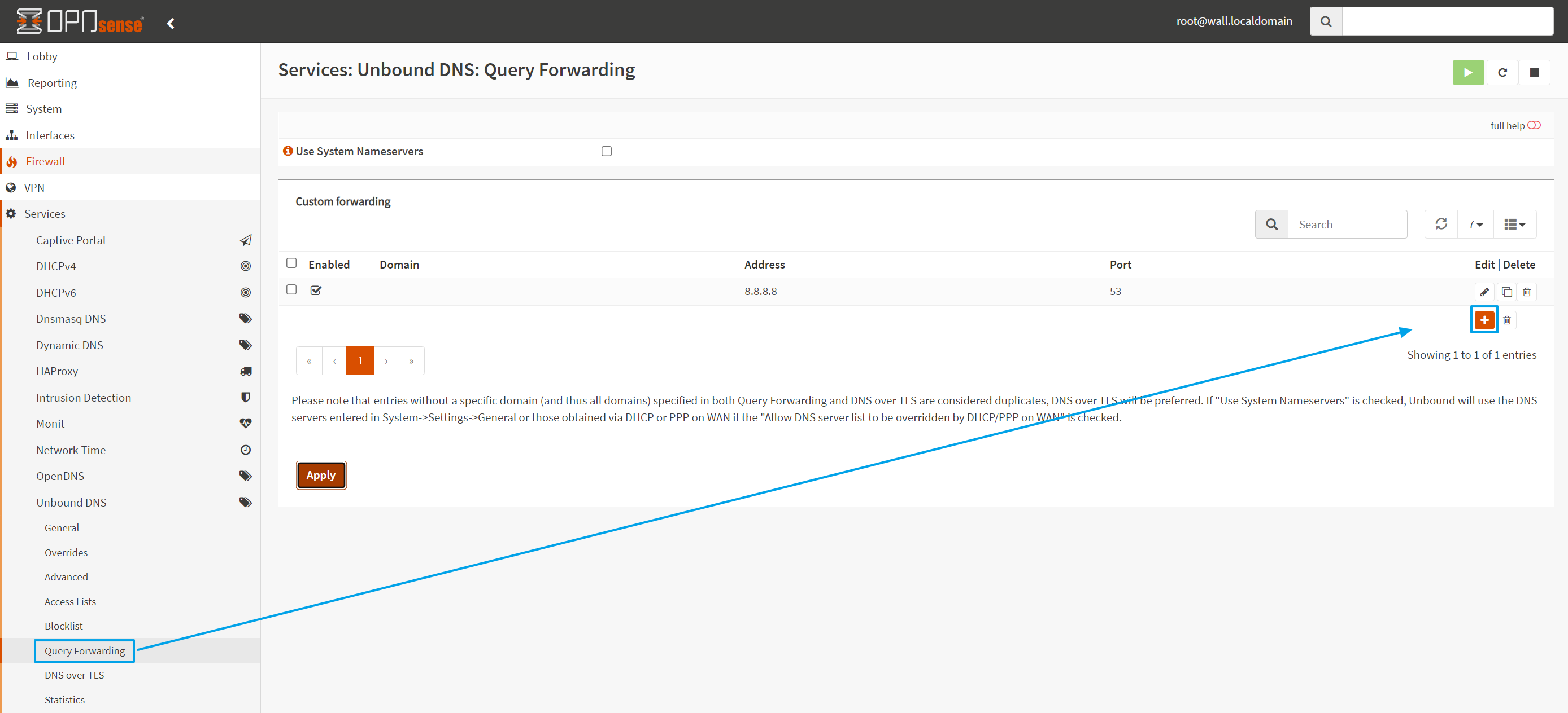 DNSSEC 설정을 활성화 합니다. Services > Unbound DNS > Query Forwarding 메뉴에서 이전에 추가했던 내용들을 모두 삭제 합니다.
